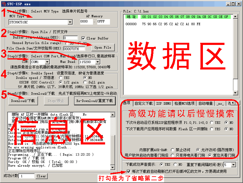 | 选择分类:当前分类——学单片机 相关联或者相类似的文章: 三十分钟一个小时学会单片机(9045) 什么是单片机?单片机有什么用? (8723) 如何用STC板将代码烧录进IC(8681) 怎样安装AT51编程板的USB转串口软件?(8206) 送给单片机爱好者——LED在线编码器(1814) 送给单片机爱好者——LED点阵在线编码器(1544) 单片机系统中的汉字显示(1492) 带语音报数功能的抢答器(1489) 用VB进行串口实时数据采集(1347) 用AT89C2051设计超声波测距仪(1171) 小小电子闹钟 生活学习良伴(1165) DS1820测温原理(1129) 几句代码实现控制摄像头(转)(1117) STC单片机选型指南(1111) 自制PIC单片机编程器(1105) USB转串口芯片CH340(1010) 快速学习单片机之黄金机会!(1010) 告戒购单片机开发实验板初学者(970) 新款实用旋转LED显示屏A(890) 使用市售 USB转RS232串口与PLC通信的测试报告 (881) 首页 前页 后页 尾页 本站推荐: | 如何用STC板将代码烧录进IC 以下是烧录程序的主要界面。烧录过程非常简单,操作也非常简单。图中红色的五个大数字就表示了整个过程。简简单单的五步就可以了(实际上只需4步)。 关于高级功能:有部分用户在写入时无意中选中了高级功能中的“下次烧录时P1.0和P1.1要对地短路”的YES选项,这样会导致正常操作也无法下载的问题,这里必须将STC89C51RC的1脚2脚这两支脚对20脚短路,就可以正常下载了,并且下载时将“P1.0和P1.1要对地短路”选项选成NO后下载,这样就可以恢复到你收到货时的样子。至于P1.0和P1.1怎么连到对地短路,那就八仙过海各显神通了。有很多人碰到这种原因后就一口咬定说收到货就是这样子,一通电就是某某样子(什么现象都有,因为好多都是烧进了自己写的程序),硬说是我们板子的问题,其实没有这个必要,这个问题我们一定会帮大家解决。 1、 本站不保证以上观点正确,就算是本站原创作品,本站也不保证内容正确。 2、如果您拥有本文版权,并且不想在本站转载,请书面通知本站立即删除并且向您公开道歉! |