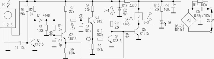 | 选择分类:当前分类——电子制作 相关联或者相类似的文章: 单片放音集成电路MM1104A(317) 厕所的幽灵~(313) 8051单片机多媒体学习光盘(313) 2006单片机编程、实验、学习、开发、仿真198元(312) KEELOQ滚动码编解码器与RFID(307) EZ编程器自制问答(306) 蝙蝠牌电蚊拍故障检修(304) 请教这个残局有解么(303) 改进TOP222P开关电源模块 (300) 自制无源RS232-485转换器 (300) 500型多用表的小改进(299) 用单片机AT89C2051控制的充电器(296) 短信运行商诈骗黑幕! (293) PF-4型电子恒温仪电路及维修(292) 胆小的不要进!超恐怖(291) 无线鼠标原理 (290) 一装响收音机(采用TA7642)(290) 一款玩具电子琴(289) 电视方格信号发生器(早已经断货)(280) PLC和单片机一体工控板(280) 首页 前页 后页 尾页 本站推荐: | 简单实用的遥控开关 2003年,第7期,类别:电子制作 本遥控开关仅用了5只三极管,整个电路可装在尺寸仅40mm×50mm的电路板上,能对各种电器进行遥控开/关操作,电路见附图。所使用的遥控发射器是普通家电遥控器。接收控制电路只要按图正确焊接,无须调试即可成功。 1、 本站不保证以上观点正确,就算是本站原创作品,本站也不保证内容正确。 2、如果您拥有本文版权,并且不想在本站转载,请书面通知本站立即删除并且向您公开道歉! |