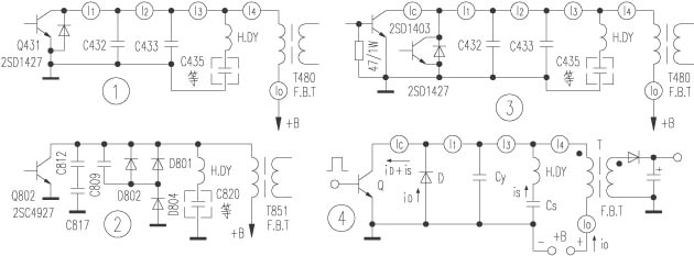 首先可以确定的是,+B提供的电流I0(注:大写的I表示电流平均值或有效值,下同)通常称为行电流,是作为电路的贮能和直接消耗的;电路中的主要耗电是CS的放电IS(形成行扫描电流)和T在行逆程时输出的整流电流。根据能量守恒原理,二者之和应等于电源的供电电流I0(为了直观起见,这里用电流代替了能量的概念,是不严格的)。实验电路(见图3)中,IC=0.33A,I1=I0=0.17A,因此行逆程后半程流经D的电流ID=IC-I1=IC-I0=0.16A,I0与ID相差的0.01A应是F.B.T消耗的(对于正常电视,此值应更大些)。再有,由于iS和iD分别是一个振荡周期的正负半周,所以iS=iD。这正好说明,在图3和图4中,由于I0和iS同时同方向流入Q的c极,所以在c极测得的电流值比通常所说的行电流即I0大一倍并非是不正常的。此外如果按行电流大小串接保险管,自然容易熔断。