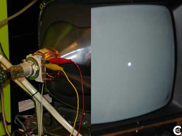 This step is kind of dangerous, and there are two ways to accomplsh it, the easy way, and the safer way. I will only cover the safe way. First clip and strip all four of the wires going to the tube, then connect them all back up using alligator clips. Then, remove one of the clips, and turn the telvision on. If you get a vertical line, then the disconnected wire is one of the horizontal drive wires, if you get a horizontal line, then you disconnected a vertical wire. Turn the television back off, then follow the same process for the other three wires to determine which direction each controls. |
