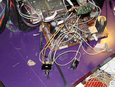 The diagram to the left shows how to run the wires, as I stated before, this TV is a type three, so, the wiring will be slightly altered. First, connect the horizontal lines coming from the tv board to one set of inputs on the switch. Next, wire the vertical lines coming from the board to the other set of inputs on the switch. Then, wire the two outputs of the switch to the vertical inputs on the tube. Once the switch is wired up, you can now connect the audio input. The audio jack we used is a mono 1/4" type. You then connect the positive and negative lines on the jack to the two horizontal inputs on the tube. Normally the way you connect the audio jack to the tv tube does not matter, however, in some cases, it does matter. When that happens, the tv will display nothing, or very little, so, just switch the way the wires are connected to the tube. |