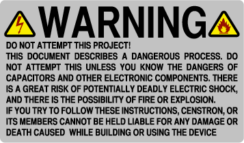 Before we begin, I have to give everyone a warning. DO NOT ATTEMPT THIS PROJECT! THIS DOCUMENT DESCRIBES A DANGEROUS PROCESS. DO NOT ATTEMPT THIS UNLESS YOU KNOW THE DANGERS OF CAPACITORS AND OTHER ELECTRONIC COMPONENTS. THERE IS A GREAT RISK OF POTENTIALLY DEADLY ELECTRIC SHOCK, AND THERE IS THE POSSIBILITY OF FIRE OR EXPLOSION. IF YOU TRY TO FOLLOW THESE INSTRUCTIONS, CENSTRON, OR ITS MEMBERS CANNOT BE HELD LIABLE FOR ANY DAMAGE OR DEATH CAUSED WHILE BUILDING OR USING THE DEVICE |