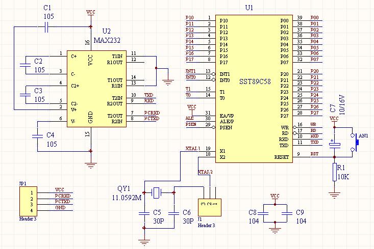 仿真器的硬件部份真的是非常的简单,主要就是由一块SST89C58和一个串口电平转换电路(MAX232)构成。