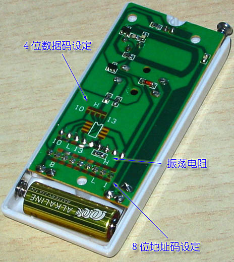 发射手柄上设置有四个按键,当按动时发射机上的按键,发射电路会被激活而进入发射状态,发射机静态时不耗电。机内装配的电池只被用于点发射状态。当用于报警设定和电器开关时,每节电池一般可用到一年以上,电池的容量为45mAH。