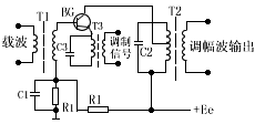 调幅电路是把调制信号和载波信号同时加在一个非线性元件上(例如晶体二极管或三极管)经非线性变换成新的频率分量,再利用谐振回路选出所需的频率成分。 调幅电路分为二极管调幅电路和晶体管基极调幅、发射极调幅及集电极调幅电路等。 通常,多采用三极管调幅电路,被调放大器如果使用小功率小信号调谐放大器,称为低电平调幅;反之,如果使用大功率大信号调谐放大器,称为高电平调幅。 在实际中,多采用高电平调幅,对它的要求是:(1)要求调制特性(调制电压与输出幅度的关系特性)的线性良好;(2)集电极效率高;(3)要求低放级电路简单。 1、基极调幅电路 图1是晶体管基极调幅电路,载波信号经过高频变压器T1加到BG的基极上,低频调制信号通过一个电感线圈L与高频载波串联,C2为高频旁路电容器,C1为低频旁路电容器,R1与R2为偏置的分压器,由于晶体管的ic=f(ube)关系曲线的非线性作用,集电极电流ic含有各种谐波分量,通过集电极调谐回路把其中调幅波选取出来,基极调幅电路的优点是要求低频调制信号功率小,因而低频放大器比较简单。其缺点是工作于欠压状态,集电极效率较低,不能充分利用直流电源的能量。 2、发射极调幅电路 图2是发射极调幅电路,其原理与基极调幅类似,因为加到基极和发射极之间的电压为1伏左右,而集电极电源电压有十几伏至几十伏,调制电压对集电极电路的影响可忽略不计,因此射极调幅与基极调幅的工作原理和特性相似。 3、集电极调幅电路 图3是集电极调幅电路,低频调制信号从集电极引入,由于它工作于过压状态下,故效率较高但调制特性的非线性失真较严重,为了改善调制特性,可在电路中引入非线性补尝措施,使输入端激励电压随集电极电源电压而变化,例如当集电极电源电压降低时,激励电压幅度随之减小,不会进入强压状态;反之,当集电极电源电压提高时,它又随之增加,不会进入欠压区,因此,调幅器始终工作在弱过压或临界状态,既可以改善调制特性,又可以有较高的效率,实现这一措施的电路称为双重集电极调幅电路。 采用图4的集电极、发射极双重调幅电路也可以改善调制特性。注意变压器的同名端,在调制信号正半波时,虽然集电极电源电压提高,但同时基极偏压也随之变正,这就防止了进入欠压工作状态;在调制信号负半波时,虽然集电极电压降低,但基极度偏压也随之变负,不致进入强过压区,从而保持在临界、弱过压状态下工作。