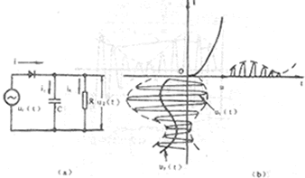 2、大信叼峰值包络检波 如图6(a)是大信号检波电路,由于输出电压交流部分与调制信号最大值成正比,故又称为直线性检波,其特点是:(1)输入电压幅度一般500毫伏以上;(2)没有偏置电压E,由于输出电压的反作用,实际上工作点处于u<0的区段[见图6(b)]。因此,大信号检波二极管,在载波一周期内,只有一段时间寻通,而另一段时间截止。大信号峰值二极管检波器的主要参数计算如下: K=cosθ