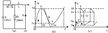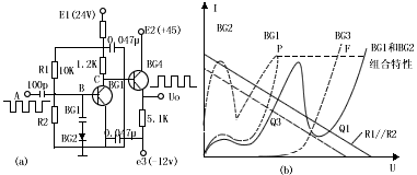 从图5(b)可见,反向二极管与隧道二极管串接后,其组合特性:在电压较低时由反向二极管决定:在电压较高时,与硅晶体管的正向特性类似,两者之间又存在负阻区,若按图5(b)设置静态点Q1,当A为低平电平时,B为高电平(0.8伏),BG3导通,集电极电压Uc3=3伏。BG4的射极输出端Uo为零伏低电平,当A点为负电平Um时,负载线向左转移,很快地进入另一稳定点Q3。UQ3低于BG3的载止电压,故BG3载止,输出,输出Uo为高电平,约18伏左右。一旦当A点回到零平时,负载线回到右边,工作点从Q3→P→F→Q1点,输出Uo又迅速回到零电平,由于隧道二极管的变化速度特别快,所以输出脉冲的前后沿很陡。晶体管示波器常用隧道二极管]作整形电路。 1、 本站不保证以上观点正确,就算是本站原创作品,本站也不保证内容正确。 2、如果您拥有本文版权,并且不想在本站转载,请书面通知本站立即删除并且向您公开道歉! |