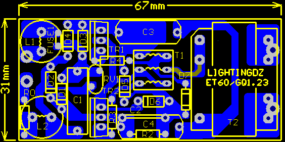 二、工作原理 L1、L2、C1组成EMC网络,一方面可以防止本机干扰泄漏到电网,另一方面又可以抑制从电网窜入的各种干扰信号。RV1是压敏电阻,用来旁路电网上的瞬间过压,以保护后级电路。T1选用φ10mm的磁环,N1、N3绕4匝,N2绕1匝,漆包线全部采用φ0.3mm线径;T2使用EE28磁芯,N1用φ0.3mm漆包线绕120匝,N2用φ1.0mm漆包线绕12匝,磁芯不留气隙,组装后须用树脂浸渍处理。 三、PCB图