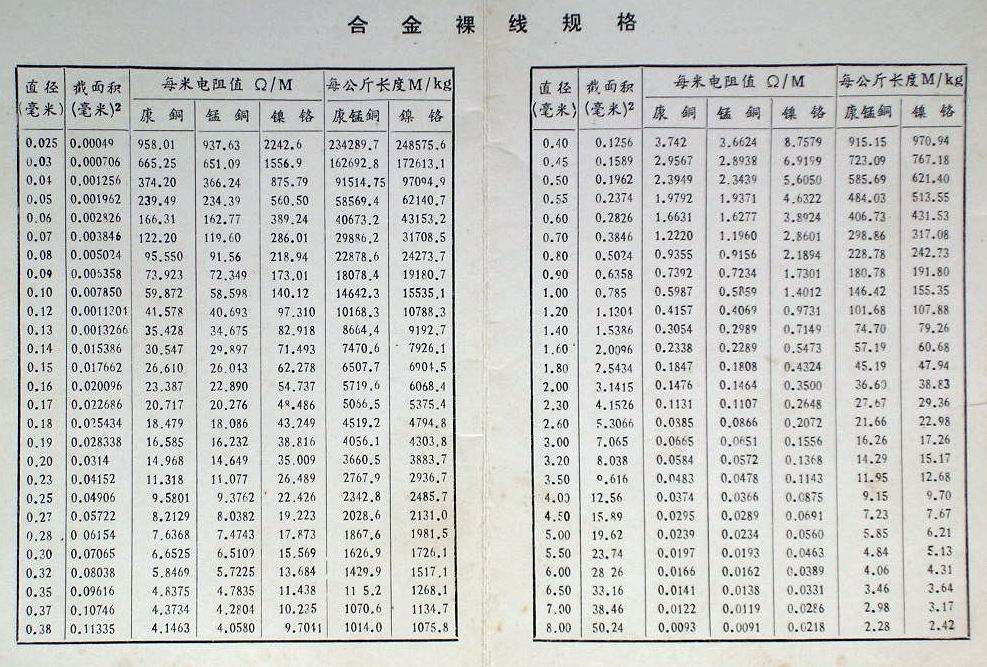 康铜、锰铜、镍铬合金线规格表