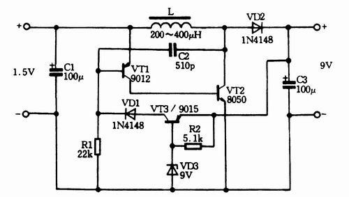 如图所示是一种稳压型直流升压电路。该电路可将一节1.5V的电池升压至9V,用来取代9V叠层电池使用。电路空载输人电流低于1.2mA,转换效率高达60%。该电路由振荡电路和稳压电路构成,其中VT1、VT2、C2组成振荡器,色码电感L为储能电感,VD2为整流二极管,C3为输出滤波电容,VT3、VD1、VD3及R2为稳定输出电压的稳压电路。输出电压约等于VD3的稳压值。