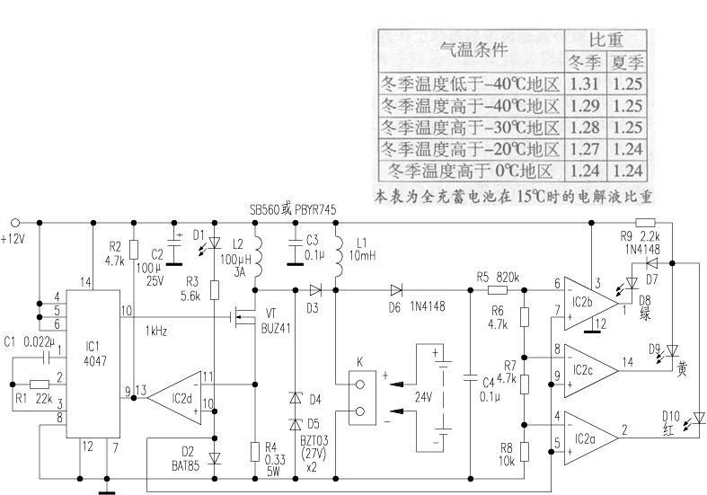 电路原理如附图所示:待恢复的铅酸蓄电池经插口K和电感L1为电路供电,L1和C3起滤除高频脉冲的作用,C2是储能电容,接上电池后,D1发光,表示电源接通。由IC(4047)IC2D(1/4LM339)和场效应管VT(BUZ41)等组成的脉冲发生器在IC1第{10}脚(Q端)输出频率为1kHz,占空比为50%的矩形脉冲,当该端输出高电平时,VT导通,流过扼流圈L2和R4的电池放电电流线性增长,L2以磁场形式储存能量。当该电流达到1A左右使R4两端电压升到0.35V时,比较器IC2D翻转输出高电平,加至IC1第{9}脚(复位端)使第{10}脚输出低电平,VT截止,存储在L2中的磁场能量在L2两端产生尖峰脉冲电压,并通过D3对蓄电池充电。