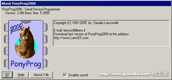 软件下载后需要安装,安装好后可以在程序组内找到“PonyProg”,单击“PonyProg2000”可启动程序。如果启动软件时你开着音箱的话可以听到一声“马叫”,呵呵,不知道作者是什么意思,不过可以将“Disable Sound”选项选择上(见下图),再启动软件时就没有声音了。
