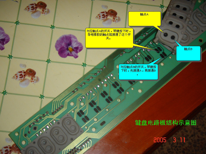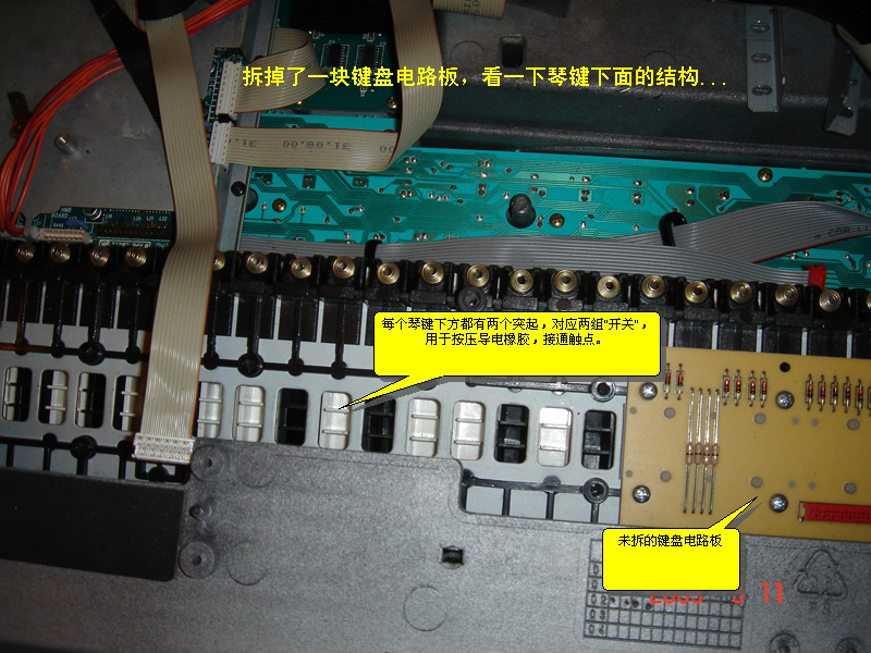 | 选择分类:当前分类——电子制作 相关联或者相类似的文章: 怎样安装AT51编程板的USB转串口软件?(8206) 装在火柴盒里的悄悄听别人讲话的发射器(1999) 红外感应电子狗制作详解(1560) 台灯触摸开关(1560) ++ 带限流保护的可调稳压电源 (1331) 分立电子开关、OTL功放详解(1274) 用单片机控制字符型液晶显示模块(1249) 厨房定时器(1160) 电子制作专用微型模块盒子(1132) 性能可靠的60W石英灯用电子变压器(1091) 做梦机的制作(1078) 自己动手制作无线话筒(944) MA21小型电子调速器的制作(939) 500米无外壳四通道遥控模块(926) 关于“D40”最早的文章(907) 用三端稳压LM317制作的甲类功放(898) ++ 汽车电池电压监视器 ++(897) 电子小鸡(896) 简单实用的遥控开关(895) 简易电话机测试装置(889) 首页 前页 后页 尾页 本站推荐: | 电子琴的力度是怎样实现的 相信用MIDI制作音乐的朋友,最熟悉的MIDI参数就是Velocity(力度)了,这不仅是最常用的,而且是大部分音序软件的KEY编辑窗口缺省显示的。不过,大家是否注意到:“Velocity”这个单词在英文中的意思并不是“力度”,而是“速度、速率”。跟音乐有关的力度术语,英文名应该是“Dynamic”! 这是为什么呢?难道MIDI标准制定的时候,专家们搞错了吗?........... 呵呵~当然不是,这是因为,MIDI就是用“速度”来模拟“力度”的! 大家知道,最常用的MIDI输入设备就是MIDI键盘,包括专门的MIDI键盘以及合成器、电子琴、电钢琴等等,这些键盘是如何来产生力度参数的呢? 简单给大家分析一下。 一般MIDI键盘产生MIDI音符的过程是这样的:按下键盘、利用键盘下方的导电橡胶和电路的接通,实现“键导通”信息,然后触发音源发声或者进入音序器录音。 下面来看一下导电橡胶的样子:注意,每一个琴键都对应两个触点开关,嗯?为什么一个琴键需要两个“开关”呢,玄机就在这里哦。 (这张照片照得不清晰,菜啊~~) ![]() 下面这张照片,是键盘底部的结构,也就是键盘下面倒过来看的样子......, 露出键盘的地方,上面的电路板已经拆掉了。 接下来这张:是拆下来这块键盘电路板的照片,大家根据图上的注解,理解琴键按下后,电路是如何接通的。 ![]() 不知道大家看明白没有,水平有限,只能说这些啦~:) ![]() 最后,再顺便说说Aftertouch(触后)参数,这在MIDI键盘上是另一种独立电路产生的,请看图: ![]() 全文完~~欢迎讨论、指正! 1、 本站不保证以上观点正确,就算是本站原创作品,本站也不保证内容正确。 2、如果您拥有本文版权,并且不想在本站转载,请书面通知本站立即删除并且向您公开道歉! |