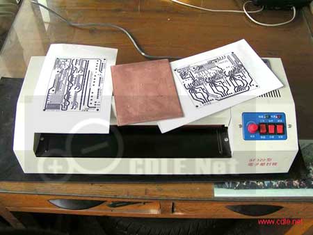 将打印好的转印图一面用胶贴贴到板子上(双面板分两次转印和腐蚀,一次难度大些),将热转印机温度调到180度左右,温度达到后进行转印,要多过几遍以保证转印质量。
