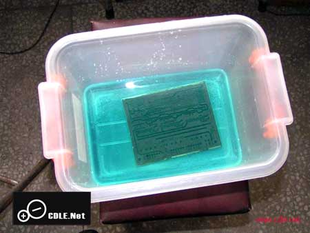 然后进行腐蚀,用买的塑料食品盒(15元)作容器,采用盐酸+双氧水+水(1:1:8)做腐蚀液,腐蚀速度快质量好,腐蚀过程大约3分钟(千万不要腐蚀过头)。