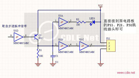 3、PCB板图TA8435的17、18、19、23管脚是走大电流的,由于排列走线较细,所以网友自己在焊接好元件后要单独在板子背面用硬线将细线段加粗,否则电机会欠电流工作。 4、R12、R13是电机电流检测电阻,其阻值决定最大工作电流,如果你电机电流不超过1.5A,则可选用0.5欧。芯片加普通散热片即可。 如果你想突破1.5A电流极限,则电阻选用如下: 当TA8435H的10脚接高电平时 电机电流2A R12/R13 电阻值选0.4欧(TA8435H加风扇强制冷却) 电机电流2.5A R12/R13 电阻值选0.32欧(TA8435H加风扇强制冷却) 5、使用Mach2软件或其它不使用使能控制的软件时 ,将TA8435使能脚(3脚)接低电平,使之总有效。 6、跳线设置在原理图上有详细标注,网友自己查看。 我发布的TA8435H第一版三轴控制板也可以实现半流控制了,不用改动原板子的任何元件和电路,只是在调整电机电流的P11、P21、P31跳线接一块补充板即可,我的补充板全是采用贴片元件,所以体积不大,只有20×12mm,插三块即可实现半流控制。 如果原电路取样电阻是0.5欧,则有脉冲时全流工作1.8A,无脉冲时半流工作1.0A(严格说不是半流),这样步进电机长时间工作也不会太热。 下面是补充板单轴插板的原理图