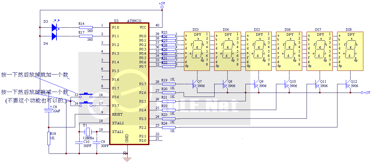 网上好友大侠画了一个计数器的电路图让我帮忙写个软件,抽空写了一个。他做好了电路我就把程序给他烧写实验,稍微修改后达到他的要求。 图中可以看到本制作的主要核心电路是用AT89C51组成的按键取值电路,S3S4分别控制计数值的加减。数码管使用的是共阳极通过3906控制。 这个计数器主要用于对键的按键次数计数,用于鼠标中的微按钮或其它按钮做QC测试用。所以在软件中用了取两次定时中断的键值做比较以达到简单防抖动和取健值的目的。读者朋友可以自行修改程序以适合自己的电路。本计数器的计数范围为0-999999,最大的频率为50Hz,当然这些参数都可以根据需要调整。程序使用的是汇编延时程序,可以改用C写,没有任何关系只是我偷懒从旧的程序中拷过来用。