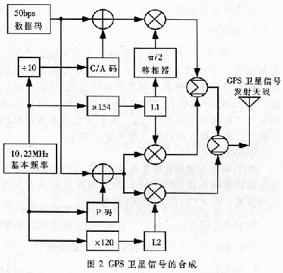 GPS卫星信号采用典型的码分多址(CDMA)调制技术进行合成(如图2所示),其完整信号主要包括载波、伪随机码和数据码等三种分量。信号载波处于L波段,两载波的中心频率分别记作L1和L2。卫星信号参考时钟频率f0为10.23MHz,信号载波L1的中心频率为f0的154倍频,即: