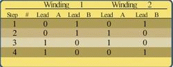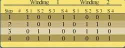 首先,要给脚1B和2B施加一个正电压,并将1A和2A接地。然后,给脚1B和2A施加一个正电压,而将1A和2B接地,这一过程其实取决于导线绕齿槽缠绕的方向,假设导线缠绕的方向与上一节所述相符。依次进行下去,我们就得到了表1中总结的激励顺序,其中,“1”表示正电压,“0”表示接地。