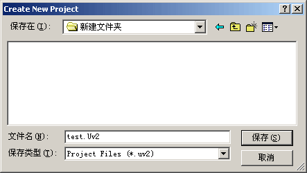 接着按下面的步骤建立您的第一个项目: (1)点击Project菜单,选择弹出的下拉式菜单中的New Project,如图1-2。接着弹出一个标准Windows文件对话窗口,如图1-3,这个东东想必大家是见了N次的了,用法技巧也不是这里要说的,以后的章节中出现类似情况将不再说明。在"文件名"中输入您的第一个C程序项目名称,这里我们用"test",这是笔者惯用的名称,大家不必照搬就是了,只要符合Windows文件规则的文件名都行。"保存"后的文件扩展名为uv2,这是KEIL uVision2项目文件扩展名,以后我们可以直接点击此文件以打开先前做的项目。 |