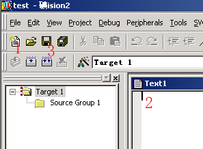 (2)选择所要的单片机,这里我们选择常用的Ateml公司的AT89C51。此时屏幕如图1-4所示。AT89C51有什么功能、特点呢?不用急,看图中右边有简单的介绍,稍后的章节会作较详细的介绍。完成上面步骤后,我们就可以进行程序的编写了。 (3)首先我们要在项目中创建新的程序文件或加入旧程序文件。如果你没有现成的程序,那么就要新建一个程序文件。在KEIL中有一些程序的Demo,在这里我们还是以一个C程序为例介绍如何新建一个C程序和如何加到您的第一个项目中吧。点击图1-5中1的新建文件的快捷按钮,在2中出现一个新的文字编辑窗口,这个操作也可以通过菜单File-New或快捷键Ctrl+N来实现。好了,现在可以编写程序了,光标已出现在文本编辑窗口中,等待我们的输入了。第一程序嘛,写个简单明了的吧。下面是经典的一段程序,呵,如果你看过别的程序书也许也有类似的程序:
