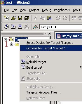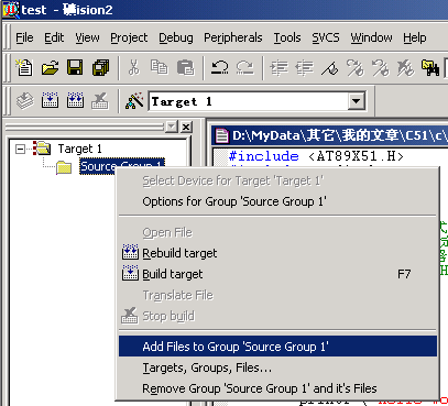 这段程序的功能是不断从串口输出"Hello World!"字符,我们先不管程序的语法和意思吧,先看看如何把它加入到项目中和如何编译试运行。 (4)点击图1-5中的3保存新建的程序,也可以用菜单File-Save或快捷键Ctrl+S进行保存。因是新文件所以保存时会弹出类似图1-3的文件操作窗口,我们把第一个程序命名为test1.c,保存在项目所在的目录中,这时你会发现程序单词有了不同的颜色,说明KEIL的C语法检查生效了。如图1-6鼠标在屏幕左边的Source Group1文件夹图标上右击弹出菜单,在这里可以做在项目中增加减少文件等操作。我们?quot;Add File to Group 'Source Group 1'"弹出文件窗口,选择刚刚保存的文件,按ADD按钮,关闭文件窗,程序文件已加到项目中了。这时在Source Group1文件夹图标左边出现了一个小+号说明,文件组中有了文件,点击它可以展开查看。 |