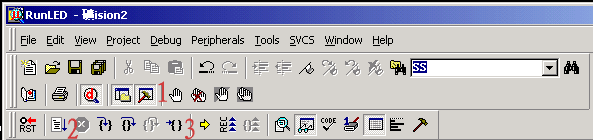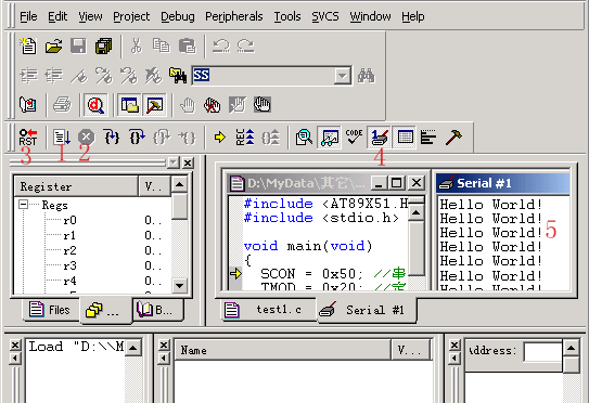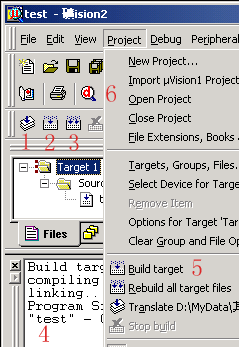 (5)C程序文件已被我们加到了项目中了,下面就剩下编译运行了。这个项目我们只是用做学习新建程序项目和编译运行仿真的基本方法,所以使用软件默认的编译设置,它不会生成用于芯片烧写的HEX文件,如何设置生成HEX文件就请看下面的第三课。我们先来看图1-7吧,图中1、2、3都是编译按钮,不同是1是用于编译单个文件。2是编译当前项目,如果先前编译过一次之后文件没有做动编辑改动,这时再点击是不会再次重新编译的。3是重新编译,每点击一次均会再次编译链接一次,不管程序是否有改动。在3右边的是停止编译按钮,只有点击了前三个中的任一个,停止按钮才会生效。5是菜单中的它们,我个人就不习惯用它了。嘿嘿,这个项目只有一个文件,你按123中的一个都可以编译。按了?好快哦,呵呵。在4中可以看到编译的错误信息和使用的系统资源情况等,以后我们要查错就靠它了。6是有一个小放大镜的按钮,这就是开启\关闭调试模式的按钮,它也存在于菜单Debug-Start\Stop Debug Session,快捷键为Ctrl+F5。 |
