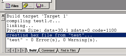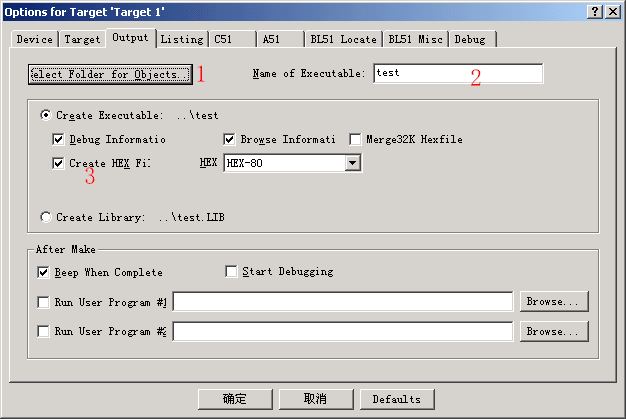 在开始C语言的主要内容时,我们先来看看如何用KEIL uVISION2来编译生成用于烧写芯片的HEX文件。HEX文件格式是Intel公司提出的按地址排列的数据信息,数据宽度为字节,所有数据使用16进制数字表示, 常用来保存单片机或其他处理器的目标程序代码。它保存物理程序存储区中的目标代码映象。一般的编程器都支持这种格式。我们先来打开第一课做的第一项目,打开它的所在目录,找到test.Uv2的文件就可以打开先前的项目了。然后右击图3-1中的1项目文件夹,弹出项目功能菜单,选Options for Target'Target1',弹出项目选项设置窗口,同样先选中项目文件夹图标,这时在Project菜单中也有一样的菜单可选。打开项目选项窗口,转到Output选项页图3-2所示,图中1是选择编译输出的路径,2是设置编译输出生成的文件名,3则是决定是否要创建HEX文件,选中它就可以输出HEX文件到指定的路径中。选好了?好,我们再将它重新编译一次,很快在编译信息窗口中就显示HEX文件创建到指定的路径中了,如图3-3。这样我们就可用自己的编程器所附带的软件去读取并烧到芯片了,再用实验板看结果,至于编程器或仿真器品种繁多具体方法就看它的说明书了,这里也不做讨论。 (技巧:一、在图3-1中的1里的项目文件树形目录中,先选中对象,再单击它就可对它进行重命名操作,双击文件图标便可打开文件。二、在Project下拉菜单的最下方有最近编辑过的项目路径保存,这里可以快速打开最近在编辑的项目。) |