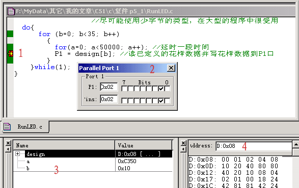编译运行上面的程序,然后按外部设备菜单Peripherals-I/O Ports-Port1就打开Port1的调试窗口了,如图5-3中的2。这时程序运行了,但我们并不能在Port1调试窗口上看到有会什么效果,这时我们可以用鼠标左击图5-3中1旁边绿色的方条,点一下就有一个小红方格在点一下又没有了,哪一句语句前有小方格程序运行到那一句时就停止了,就是设置调试断点,同样图5-2中的1也是同样功能,分别是增加/移除断点、移除所有断点、允许/禁止断点、禁止所有断点,菜单也有一样的功能,另外菜单中还有Breakpoints可打开断点设置窗口它的功能更强大,不过我们这里先不用它。我们?quot;P1 = design[b];"这一句设置一个断点这时程序运行到这里就停住了,再留意一下Port1调试窗口,再按图5-2中的2的运行键,程序又运行到设置断点的地方停住了,这时Port1调试窗口的状态又不同了。也就是说Port1调试窗口模拟了P1口的电平状态,打勾为高电平,不打勾则为低电平,窗口中P1为P1寄存器的状态,Pins为引脚的状态,注意的是如果是读引脚值必须把引脚对应的寄存器置1才能正确读取。图5-2中2旁边的{}样的按钮分别为单步入,步越,步出和执行到当前行。图中3为显示下一句将要执行的语句。图5-3中的3是Watches窗口可查看各变量的当前值,数组和字串是显示其头一个地址,如本例中的design数组是保存在code存储区的首地址为D:0x08,可以在图中4 Memory存储器查看窗口中的Address地址中打入D:0x08就可以查看到design各数据和存放地址了。如果你的uVision2没有显示这些窗口,可以在View菜单中打开在图5-2中3后面一栏的查看窗口快捷栏中打开。