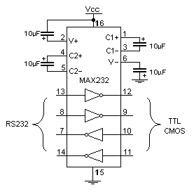除法运算符和一般的算术运算规则有所不同,如是两浮点数相除,其结果为浮点数,如10.0/20.0所得值为0.5,而两个整数相除时,所得值就是整数,如7/3,值为2。像别的语言一样C的运算符与有优先级和结合性,同样可用用括号"()"来改变优先级。这些和我们小时候学的数学几乎是一样的,我也不必过多的说明了。 :( 还有这么多运算符呀!暂时停一停吧,我们先来做一个实验吧。学习运算符和另外一些知识时,我们还是给我们的实验板加个串行接口吧。借助电脑转件直观的看单片机的输出结果,以后我还会用一些简单的实例讲解单片机和PC串口通讯的简单应用和编程。如果你用的是成品实验板或仿真器,那你就可以跳过这一段了。 在制作电路前我们先来看看要用的MAX232,这里我们不去具体讨论它,只要知道它是TTL和RS232电平相互转换的芯片和基本的引脚接线功能就行了。通常我会用两个小功率晶体管加少量的电路去替换MAX232,可以省一点,效果也不错(如有兴趣可以查看http://www.cdle.net网站中的相关资料)。下图就是MAX232的基本接线图。