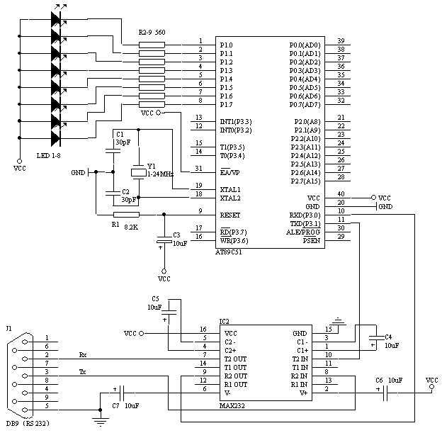 在上两课的电路的基础上按图7-3加上MAX232就可以了。这大热天的拿烙铁焊焊,还真的是热气迫人来呀:P串口座用DB9的母头,这样就可以用买来的PC串口延长线进行和电脑相连接,也可以直接接到电脑com口上。