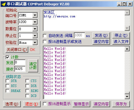 做好后我们就先用回第一课的"Hello World!"程序,用它来和你的电脑说声Hello!把程序烧到芯片上,把串口连接好。嘿嘿,这时要打开你的串口调试软件,没有就赶快到网上DOWN一个了。你会用Windows的超级中端也行,不过我从不用它。我用http://emouze.com的comdebug,它是个不错的软件,我喜欢它是因为它功能好而且还有"线路状态"功能,这对我制作小玩意时很有用。串口号,波特率调好,打开串口,单片机上电,就可以在接收区看到不断出现的"Hello World!"。一定要先打开软件的串口,再把单片机上电,否则可能因字符不对齐而看到乱码哦。