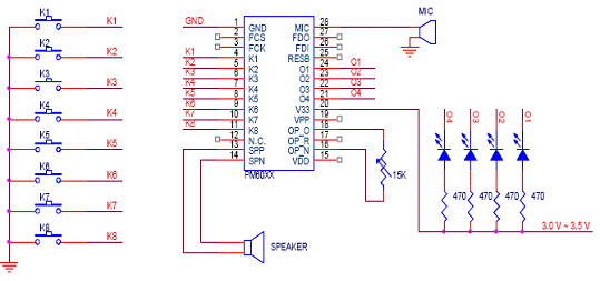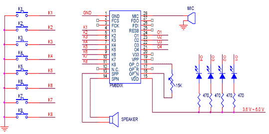 在PM60系列芯片的并行控制方式下可以分8段语音录放,K1~K8脚可以分别触发与其对应的8段语音(低有效),在烧录芯片的时候,可以设置为下降沿触发或者低电平触发。K1~K8端口有内置上拉电阻和防抖动设计,可直接外接按键来触发放音。也可用单片机口线直接对其操作。