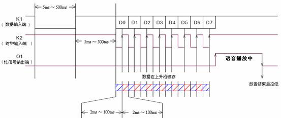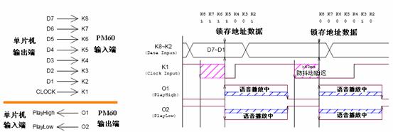 在串行输入接口工作方式下,K1为数据端,K2为同步时钟端,O1为忙信号端。地址数据在时钟上升沿锁存输入到PM60芯片内。语音段的地址为0x80H~0xFFH。外部单片机直接送入要放音的段地址即可播放,结束时PM60的忙信号拉低,在判断一段语音结束时,外部单片机再送下一段语音的段地址。