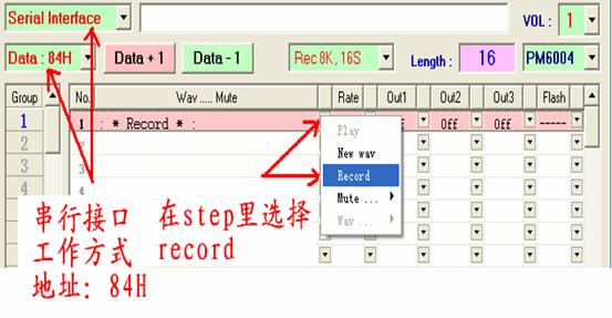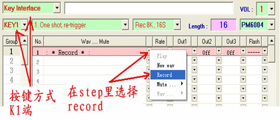 PM60的录音需要在编程软件上预先设置好录音存储的位置,如果采用按键操作模式,则选择存储在K1~K8端;如果采用微控制器操作模式,则选择存储在对应的地址。两种设置方式如下图所示:
