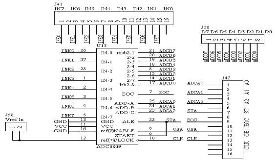 9.模数转换模块 系统板上的模数转换模块采用ADC0809芯片,组成8路8位的A/D转换,8路模拟电压的输入由IN0-IN7的端口输入,控制ADC0809芯片工作的控制信号由“CLK OE EOC ST A2 A1 A0”端口输入,转换的数据从D0-D7的端口输出。具体的电路原理图如图1.9所示: