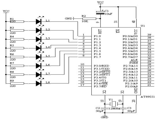 把“单片机系统”区域中的P1.0-P1.7用8芯排线连接到“八路发光二极管指示模块”区域中的L1-L8端口上,要求:P1.0对应着L1,P1.1对应着L2,……,P1.7对应着L8。