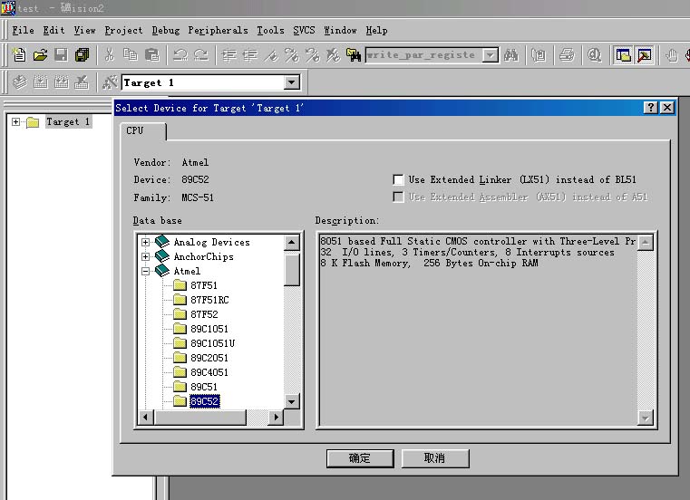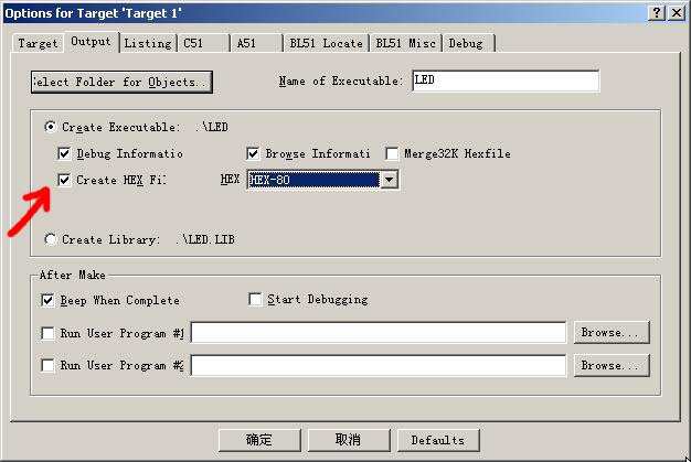 | 选择分类:当前分类——学单片机 相关联或者相类似的文章: 三十分钟一个小时学会单片机(9045) 什么是单片机?单片机有什么用? (8723) 如何用STC板将代码烧录进IC(8681) 怎样安装AT51编程板的USB转串口软件?(8206) 送给单片机爱好者——LED在线编码器(1814) 送给单片机爱好者——LED点阵在线编码器(1544) 单片机系统中的汉字显示(1492) 带语音报数功能的抢答器(1489) 用VB进行串口实时数据采集(1347) 用AT89C2051设计超声波测距仪(1171) 小小电子闹钟 生活学习良伴(1165) DS1820测温原理(1129) 几句代码实现控制摄像头(转)(1117) STC单片机选型指南(1111) 自制PIC单片机编程器(1105) USB转串口芯片CH340(1010) 快速学习单片机之黄金机会!(1010) 告戒购单片机开发实验板初学者(970) 新款实用旋转LED显示屏A(890) 使用市售 USB转RS232串口与PLC通信的测试报告 (881) 首页 前页 后页 尾页 本站推荐: | 如何用KeilC51将ASM文件编译成Hex文件! 可在本站下载KeilC演示视频教程或按如下步骤进行: 1)点击菜单project,选择new project: ![]() 2)然后选择你要保存的路径,输入工程文件的名字,比如保存到keil目录里,工程文件的名字为test. 如下图所示,然后点击保存. ![]() 3)这时会弹出一个对话框,要求你选择单片机的型号,你可以根据你使用的单片机来选择,keil c51几乎支持所有的51核的单片机,如果你设计的是华邦的W77E58,可以选择winbond->W77E58,但是有一些版本,比如6.02,对它不能仿真,但是可以选择dallas的ds80c320来代替设计W77E58,两者的内核是一样的,只是w77e58带flash rom,而ds80c320没有flash rom,如果你的软件在仿真W77e58的时候有问题,那么就选用ds80c320 .我这里还是以大家用的比较多的Atmel 的89c52来说明,如图所示,选择89c52之后,右边一栏是对这个单片机的基本的说明,然后点击确定. ![]() 4)这时要新建一个源程序文件,建立一个汇编或c文件,如果你已经有源程序文件,可以忽略这一步.点击菜单File->New: ![]() 5)输入一个简单的程序,如下: ![]() 5)选择菜单File_>SAVE: ![]() 6)选择你要保存的路径,在文件名里输入文件名,注意一定要输入扩展名,如果是c程序文件,扩展名为.c,如果是汇编文件,扩展名为.a51,如果是ini文件,扩展名为.ini,其他文件类型,比如注解说明文件,可以保存为.txt的扩展名.那么我们这里是要存储一个c源程序文件,所以输入.c扩展名,保存为test.c的名字,(也可以保存为其他名字,比如learn.c等),点击保存. ![]() 7)点击Target 1前面的+号,展开里面的内容source Group1: ![]() 8)用右键点击Sourece Group 1(注意用鼠标的右键,而不是左键),将弹出一个菜单,选择Add Files to Guoup"Source Group 1". ![]() 9)选择刚才的文件test.c, ![]() 文件类型选择C Source file(*.c).因为我们的是c程序文件,所以选择该类型,如果是汇编文件,就选择asm source file.如果是目标文件,选择Object file,如果是库文件,选择Library file.最后点击Add.点击add之后,窗口不会消失,(如果要添加多个文件,可以不断添加),添加完毕此时再点击Close关闭该窗口. ![]() 10)这时在source group 1 里就有test.c文件,如图: ![]() 11)用鼠标右键(注意用右键)点击左边的Target 1,会出现一个菜单,选择Options for Target "Target 1",会出现一个选项,如下图,选中“Create Hex File",红色箭头所示! ![]() 12)在test.c上点击鼠标右键,在出现的下拉菜单中选择“build target”,看状态栏,若是:"test" - 0 Error(s), 0 Warning(s).”,恭喜你成功了,看看你的文件夹吧,是否多了个test.hex。还不赶快烧入芯片试试! 1、 本站不保证以上观点正确,就算是本站原创作品,本站也不保证内容正确。 2、如果您拥有本文版权,并且不想在本站转载,请书面通知本站立即删除并且向您公开道歉! |