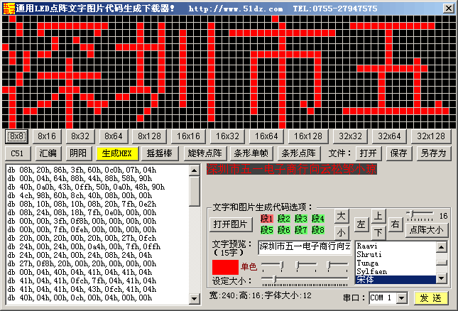 本软件可以自行修各单元点并立即生成代码,也可以输入文字自动生成代码,也可以打开图片自动生成代码!还可以通过串口自动发送代码。点击软件中的 就可以将文字或者图片自动生成代码,生成代码后,再点击右下角的就可以将代码通过选定的串口以9600波特率向产品发送!