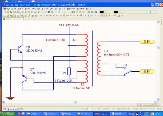 电路是老式晶体管的,后级不用电容放电,变压器直接输出,功率不大,空载600V用100W的灯泡作负载有250V,200W有150V左右,电鱼范围浅水1米左右,当时我们已经很满意,毕竟可以电鱼了。下面是原理图,很简单,适合初学电子者制作,变压器用舌宽25mm或28mm的硅钢片,叠厚15mm左右,注意层间绝缘。 大功率管3DD15D用螺丝上在100*200mm的两片散热器上,散热器可用做门窗的铝合金方管据开。R1用15W水泥电阻,起振后带上100W灯泡负载,调节R1使灯泡最亮发白光,比接照明220V还亮,这样在浅水中电鱼就没问题了,做的好的话可使200W灯泡发白光。如果不起振只需将L2的两端抽头对调。不知是电路问题还是自己水平问题,这个电路功率最大我只做到了200W......