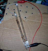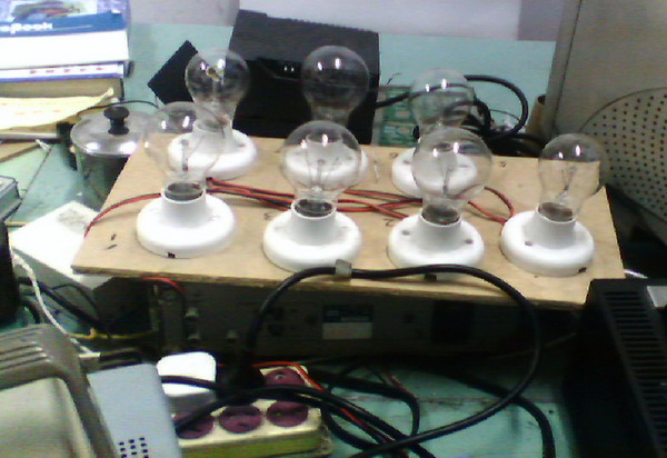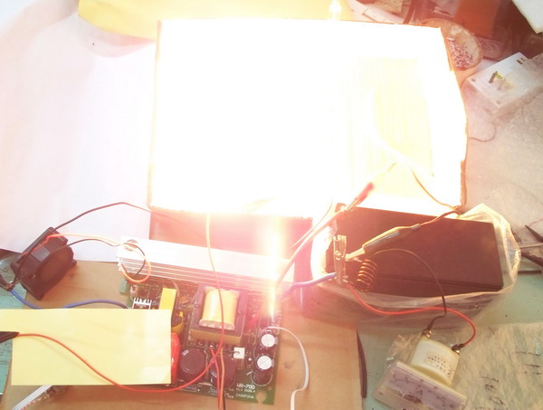 再后来用两个彩电高压包的铁氧体并联,组成口子形,线圈分别绕在两个柱子上,初级1.5,14+14圈,次级480圈.用15D的管子半边12个,这个功率做到了300W.带200W+100W220V灯泡还有200V.效率有75%左右.我用12V32AH的电瓶下河电鱼,间歇工作(电鱼机都是间歇工作的)一天电七八个小时,可以电两天冲一次电.不过我们那里是淡水,水质较好,水也不深.我的机子个人背着很轻松,一个人可以电一天.