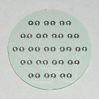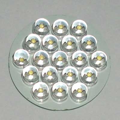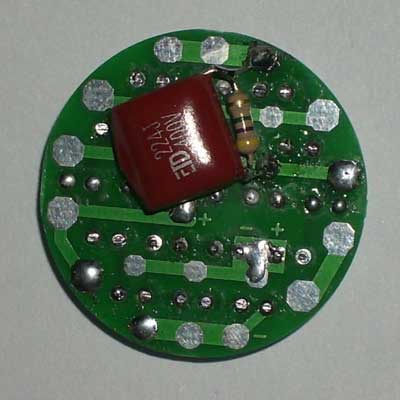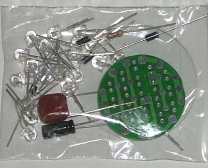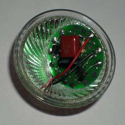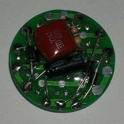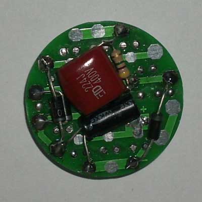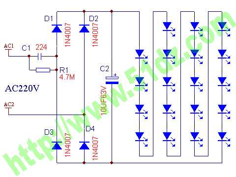套件说明,罗口的电镀玻璃反光灯杯1只、圆型透明的平面封口玻璃1块、0.8mm高精度双面电路板1块、高亮白光草帽灯19只、400V224高压金属膜限流电容1只、1N4007整流二极管4只、4.7M高压泄流电阻1只、63V10UF消闪烁用滤波电容1只。 制作装配时需要电烙铁、万用表、尖嘴钳、剪钳、热熔胶枪(胶)等工具消耗品请自备。市面上相同功能和特性的LED灯售价高达18元以上,更有高达百元以上的LED灯,现在大家自己动手,只需要十多元就可以立即享用这世界上最新的环保省电LED照明技术!学校组织批量购买,每50套赠送一套备品,免费提供部分元件备品! 电路原理图:工作原理非常简单,通过电容限流了发光二极管的工作电流小于25MA,加上C2吸收了开关灯的冲击电流,有效的确保了发光二极管的使用寿命。采用电容降压,不消耗电能,不发热,效果好。(发光二极管的工作电流由C1的容量决定,如图最大不能超过474,如果发光二极管的工作电流超过了50MA,估计发光二极管的寿命会大大缩短!如果觉采用224亮度已经太亮,可以换容量为104的电容,这样LED的工作寿命会超过几万小时。)