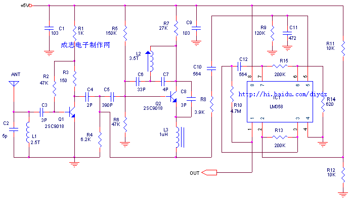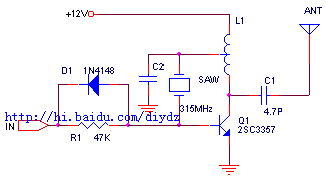 | 选择分类:当前分类——电子入门 相关联或者相类似的文章: 测电流法(505) 器件的筛选与检测(505) 飞行写真(505) 几款直流升压电路(504) 重复式定时电路(503) 28. 数字电压表(503) 防抖动轻触开关(503) 外星人来的那一天(503) 常用运算放大器(502) 315MHz无线红外探测器(502) 怎样利用音乐改善心理状态?(502) 巧购电子元器件(502) 单片机可编程广播自动播出系统(502) 小小电容之大大观(502) 购物21个月后以诚信为理由要求退款(500) 电子高压灭蝇器电路图解(500) 电子点火器电路图及工作原理分析(500) 蓝牙收发芯片RF2968的原理及应用 (500) 如何DIY 投影机?新手知识讲座!(500) 学电子----电子元件介绍(500) 首页 前页 后页 尾页 本站推荐: | 315M遥控电路的设计 早期的发射机较多使用LC振荡器,频率漂移较为严重。声表器件的出现解决了这一问题,其频率稳定性与晶振大体相同,而其基频可达几百兆甚至上千兆赫兹。无需倍频,与晶振相比电路极其简单。以下两个电路为常见的发射机电路,由于使用了声表器件,电路工作非常稳定,即使手抓天线、声表或电路其他部位,发射频率均不会漂移。和图一相比,图二的发射功率更大一些。可达200米以上。