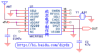 接收机可使用超再生电路或超外差电路,超再生电路成本低,功耗小可达100uA左右,调整良好的超再生电路灵敏度和一级高放、一级振荡、一级混频以及两级中放的超外差接收机差不多。然而,超再生电路的工作稳定性比较差,选择性差,从而降低了抗干扰能力。下图为典型的超再生接收电路。 ![]() 超外差电路的灵敏度和选择性都可以做得很好,美国Micrel公司推出的单片集成电路可完成接收及解调,其MICRF002为MICRF001的改进型,与MICRF001相比,功耗更低,并具有电源关断控制端。MICRF002性能稳定,使用非常简单。与超再生产电路相比,缺点是成本偏高(RMB35元)。下面为其管脚排列及推荐电路。 ![]() ICRF002使用陶瓷谐振器,换用不同的谐振器,接收频率可覆盖300-440MHz。MICRF002具有两种工作模式:扫描模式和固定模式。扫描模式接受带宽可达几百KHz,此模式主要用来和LC振荡的发射机配套使用,因为,LC发射机的频率漂移较大,在扫描模式下,数据通讯速率为每秒2.5KBytes。固定模式的带宽仅几十KHz,此模式用于和使用晶振稳频的发射机配套,数据速率可达每秒钟10KBytes。工作模式选择通过MICRF002的第16脚(SWEN)实现。另外,使用唤醒功能可以唤醒译码器或CPU,以最大限度地降低功耗。 MICRF002为完整的单片超外差接收电路,基本实现了“天线输入”之后“数据直接输出”,接收距离一般为200米。 1、 本站不保证以上观点正确,就算是本站原创作品,本站也不保证内容正确。 2、如果您拥有本文版权,并且不想在本站转载,请书面通知本站立即删除并且向您公开道歉! |