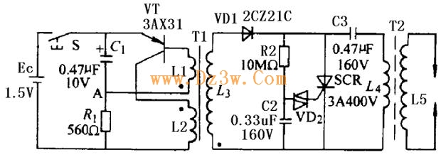 本文提供一个常用的电子点火器电路,适用于煤气灶、燃气热水器等常需要电子点火器的设备,该电子点火器也可独立使用或用于电子打火机。 下图所示电路为该电子点火器电路原理图,该电路由单节AA或AAA电池供电,现将其工作原理说明如下。 电路中C1、R1、VT、L1、L2为利用变压器耦合形成正反馈的自励振荡电路。