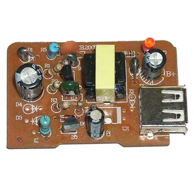 安装、焊接好全部元件后,仔细检查一下各个部分,不能有连锡、虚焊或漏焊的。发现问题及时修正。 通电测试线路板: 仔细检查线路板安装无误后,要通电试板时,可以在PCB板直接焊一个220V插头线,为了安全起见,请大家先在电源串联一个10W的白炽灯泡,以防止短路或者接错,千万注意安全,还有,元件一不小心就烧坏了,烧坏了需要再买才行。如果安装无误,用万用表可以测得USB 1脚和4脚应有5V的电压输出,电源指示灯亮,确认电路板装配无误。