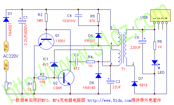 | 选择分类:当前分类——电子入门 相关联或者相类似的文章: [推荐]如何学好电子(32017) 今夏购物回馈送大礼并可参加抽奖活动(32000) 免费抄版软件——文字或图片转PCB文件(31341) 74系列芯片资料 (11661) 两匹马的故事(10519) 知道中国人的安全套用完了送哪里去了?(10473) 互联网精华文章摘录(10473) 节能灯套件制作说明(9999) 无插件免安装功能强大的象棋打谱演示软件(9985) 一切都是玩!一切为了玩!(9523) 三十分钟一个小时学会单片机(9045) 什么是单片机?单片机有什么用? (8723) 如何用STC板将代码烧录进IC(8681) 怎样安装AT51编程板的USB转串口软件?(8206) 多功能电子实验套件助你成功!(8073) 电影敲诈手段“遥控炸弹”在深圳真实上演(5300) 2012年春节放假通知(4300) 当你扛不住的时候就读一遍(4300) USB充电器套件制作说明(3141) 消费2000元,就可能得到1200元的现金奖励(2857) 首页 前页 后页 尾页 本站推荐: | USB充电器套件制作说明 USB充电器套件,又名MP3MP4充电器,输入AC160-240V,50/60Hz,额定输出:DC 5V 250mA(标签贴纸为500mA,如果要长期输出更大电流,请更换Q1为13003)。MP3和MP4在全国范围大量流行,不过作为日常用品的充电器由于直接和220V高压相连,具有故障率较高,容易损坏的特点,特别是买到那些不成熟的产品后,真是苦不看言。最后,受学校老师委托,我们联系到了一款成熟量产的充电器套件,现在一同给广大电子爱好者分享。 下面是对着实物绘制的电路原理图:(电路板上有多种元件安装方法,安装请与原理图、实物图为准,PCB板上有些元件孔是不要安装的,有些元件要装在别的元件孔上,这点请注意!)