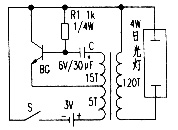 电路原理如图,在新窗口打开查看!利用升压变压器将3V的直流电变为100V的交流电,从而驱动4W日光灯工作。制作时,用1个2SB202或2SB200型晶体管组成一振荡器,把直流电变为交流;升压变压器采用E30型铁粉芯,初级用φ0.4mm的漆包线绕20匝,从5匝处抽头,次级用φ0.1mm的漆包线绕120匝即可。