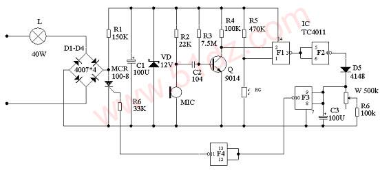 220V的市电经过灯泡和全桥整流后一路加在单向可控硅MCR 100-8上,另一路经R1限流后给本电路供电。由于一开始可控硅无触发信号,呈关断状态,灯不亮。C1为主滤波电容,VD为12V的稳压二极管给本电路提供稳定的工作电压。Q1、R3、R4组成前级电压放大电路,微弱声音信号(话话声,脚步或掌声)由话筒MIC接收并转换成电信号,经C2耦合到Q9014的基极进行电压放大,R2为MIC的供电限流电阻,R3、R4是Q9014的偏置电阻,放大的信号送到与非门(F1)的2脚。光敏电阻RG和R5组成串联分压电路,夜晚环境下无光时,光敏电阻的阻值很大,TC4011 一脚电压为高(反之则低),F1和F2将信号进行两级整形放大。后经D5整流加在F3的输入端及同时给C3充电,很快C3上就充到了门电路的翻转电压,  F3输出低电平,F4输出高电平,经R7加在单向可控硅的G极,可控硅导通,灯泡点亮。在这个过程中,声音信号只需一个瞬时即可,这是因为,当声音信号来时,C3上的电压很快就充到了电源电压,而这时即使声音信号消失, C3只能通过W、R6进行放电,所以C3上将维持一段时间的高电平,这个高电平将维持单向可控硅导通,这就是延时的效果,灯亮后所能延时的长短取决于C3上维持高电平的时间长短,所以选择C3、W和R6的组合,可以控制延时的长短。当C3上的电压放到低于1/3电源电压时,F3输出高电平,F4输出低电平,单向可控硅的控制端没了触发信号,当交流电压过零时就被关断,灯熄灭。