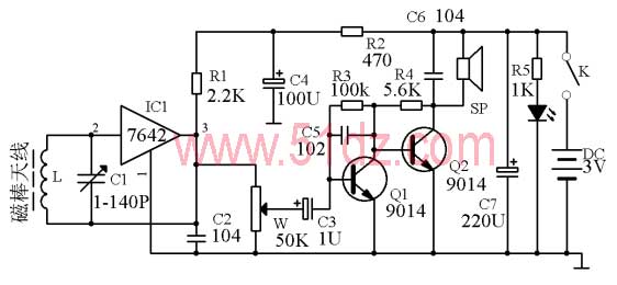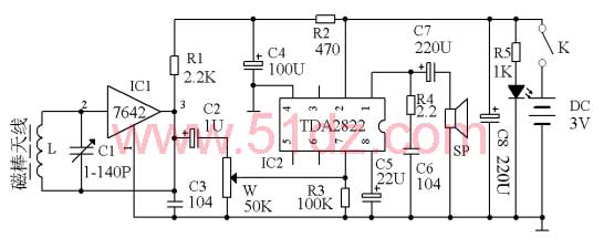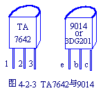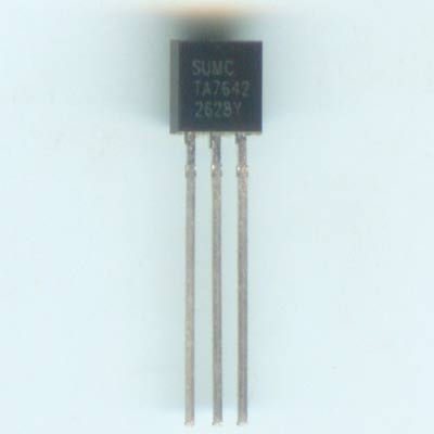 TA7642是一只微型集成电路,外形和TO-92封装的三极管(如9014)相同(见图)。别看它体积很小,它的内部却集成了10只三极管,包括三级高放、一级检波和一级低频缓冲放大。 本站实验套件中有采用TA7642收音IC制作的简易收音机,原理图如下。